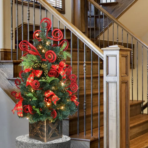 Seated in a decorative urn base, this tree is trimmed with red berries, ribbons and ball ornaments