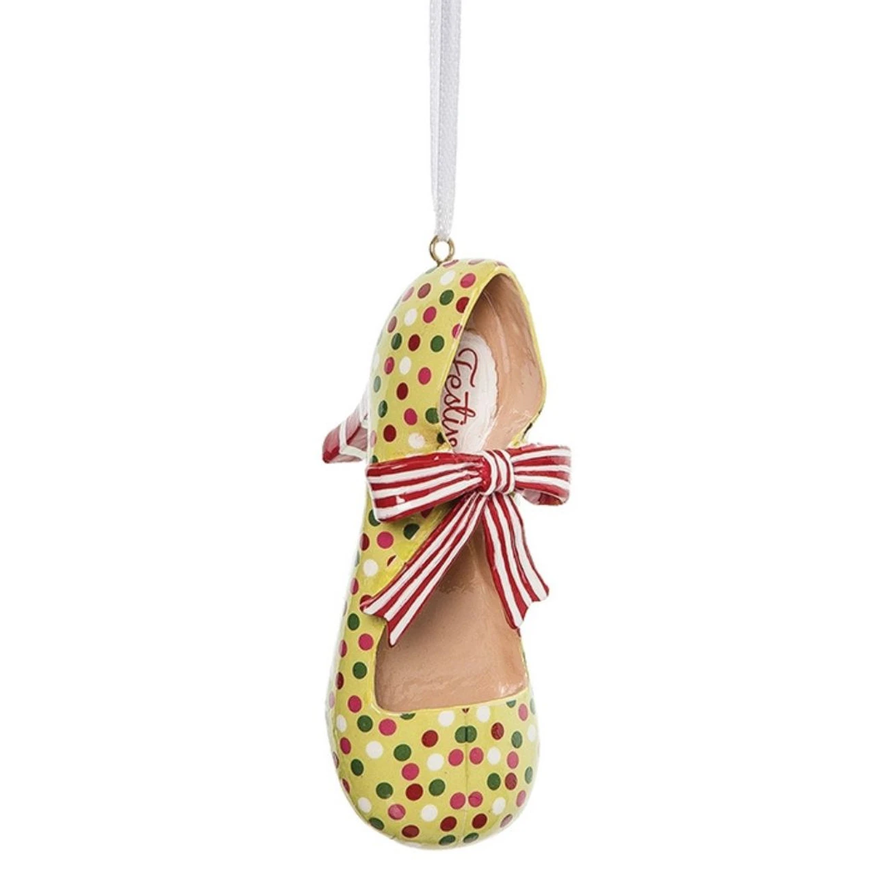 Get your party shoes ready with this fun and funky yellow polka dotted festive shoe.