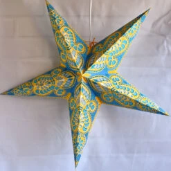 24″ Turquoise / Yellow Peacock Glitter Paper Star Lantern, Hanging Decoration
